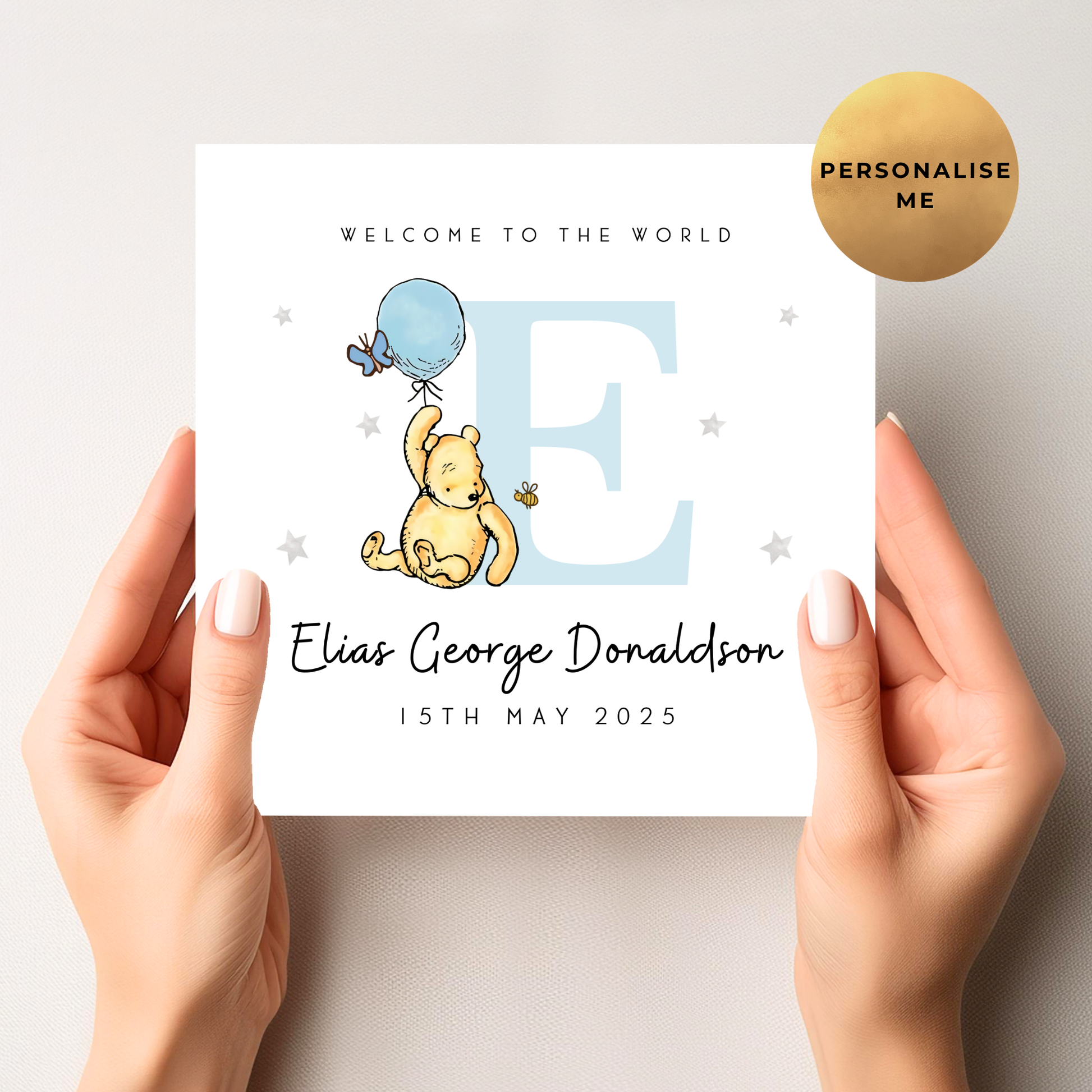 Celebrate the joy of welcoming a newborn with our heartfelt Personalised Winnie The Pooh New Baby Card, beautifully customised for the proud new parents. Crafted with love and warmth, this card is perfect for conveying your congratulations and making a lasting impression on their special day—order yours now to share in their joy!